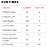 8 Licht Modis wählbar, einschliesslich garantierter Laufzeiten von bis zu 50 Stunden